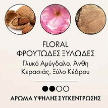 Το Γλυκό Αμύγδαλο, το Μανταρίνι και τα Φύλλα Δάφνης ανοίγουν το άρωμα με μια φρέσκια και φρουτώδη γλυκύτητα. Στην καρδιά, το Άνθος Κερασιάς αναμειγνύεται με το ντελικάτο Γλυκό Αμύγδαλο και την τονωτική Μανόλια. Ένα ξυλώδες πέπλο από Κέδρο, Μusk και Ηλιοτρόπιο περιβάλλει τη φυσική σύνθεση, εξισορροπώντας το ευωδιαστό άρωμα με μια απαλότητα για καθημερινή χρήση.