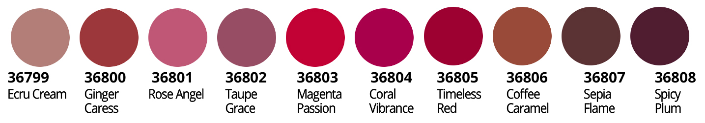 | απόχρωση | Ecru Cream – 36799, Ginger Caress – 36800, Rose Angel – 36801, Taupe Grace – 36802, Magenta Passion – 36803, Coral Vibrance – 36804, Timeless Red – 36805, Coffee Caramel – 36806, Sepia Flame – 36807, Spicy Plum – 36808 |